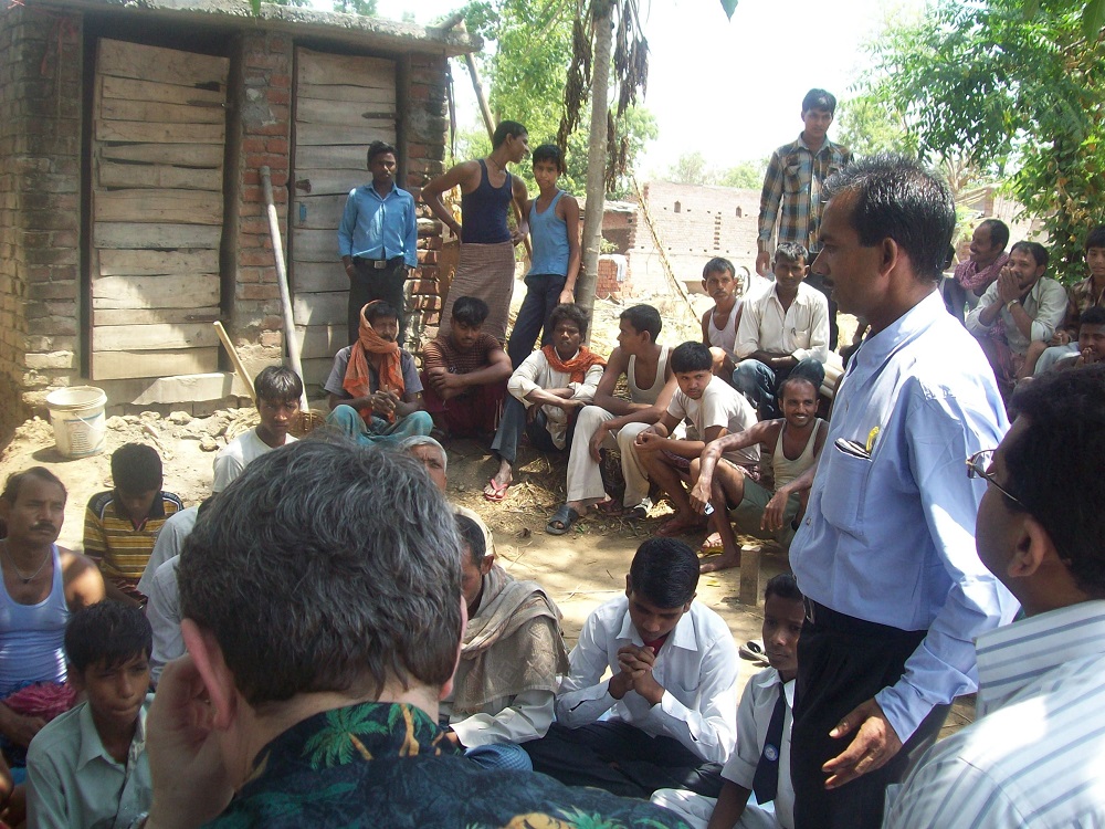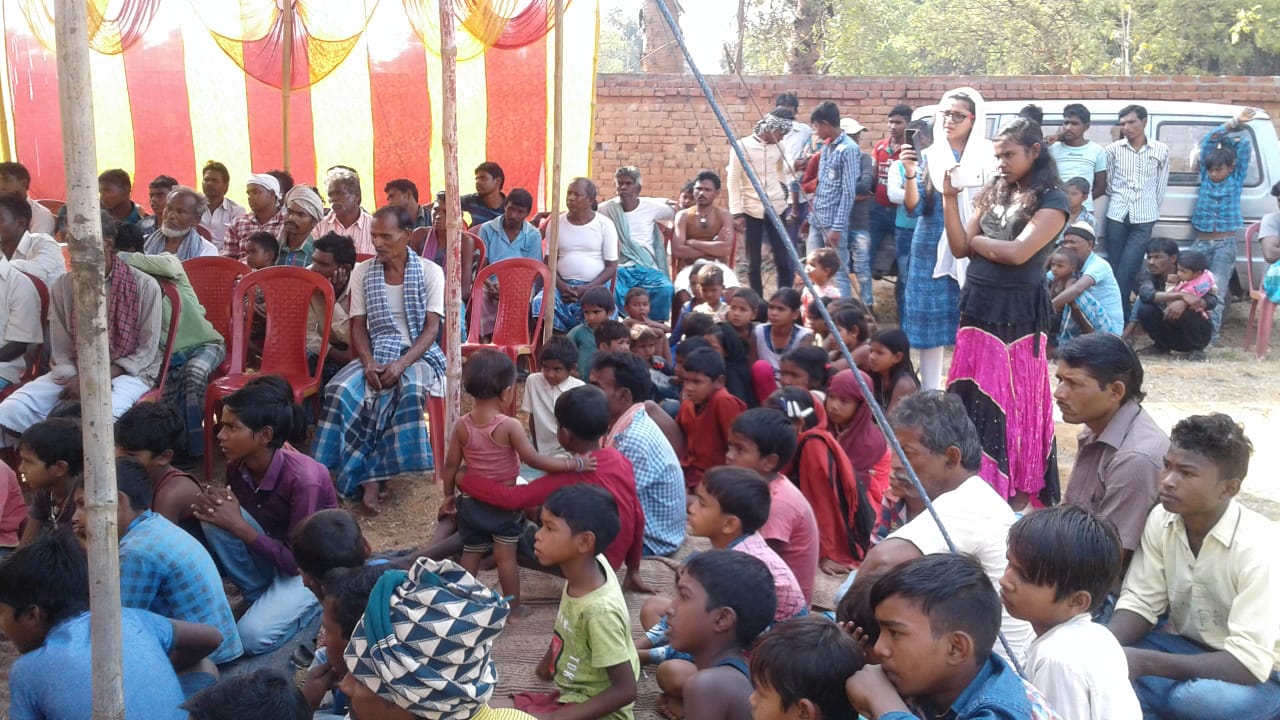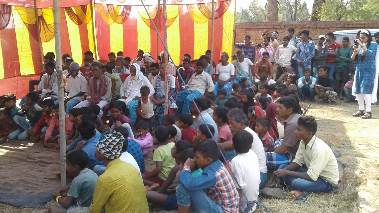 Which many in small small groups of villagers in number of twenty to thiry are gathering and listening and discussing and understanding the issues which is impacting their society.